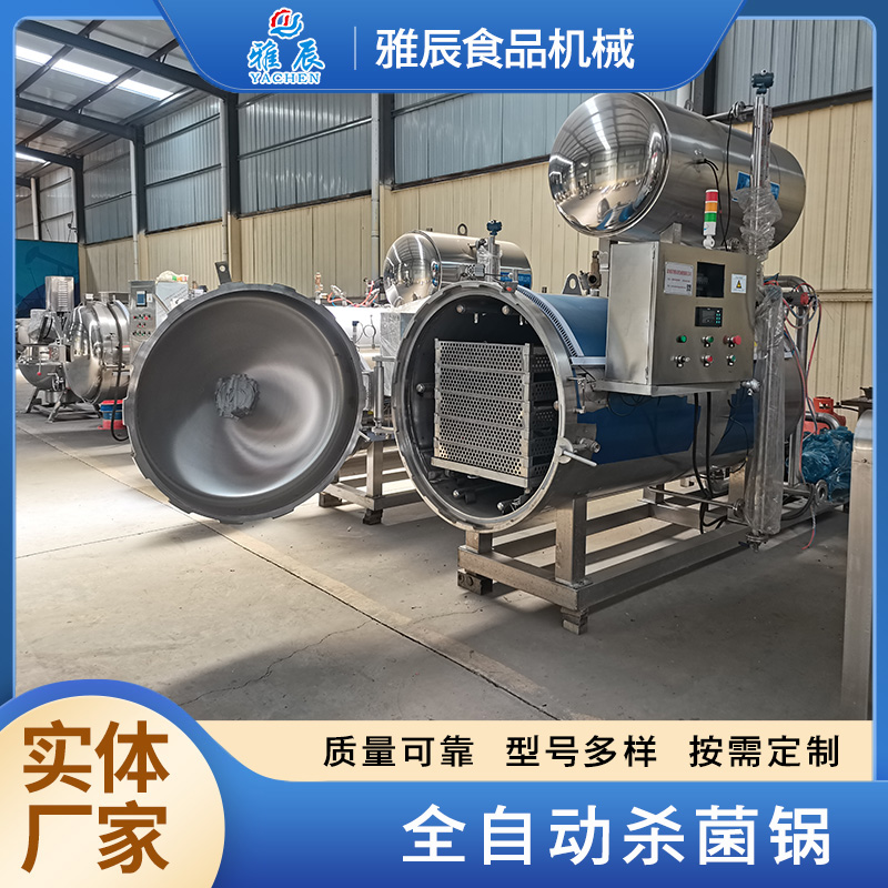 在熱水池內(nèi)用蒸汽將水溫升至沸騰,啟動水泵用大口徑流量管道把熱水抽到鍋內(nèi)進行直接殺菌。在熱水達(dá)到一定水位時,隨即啟動熱水循環(huán)泵,把鍋內(nèi)熱水進行循環(huán),采用三點出水八點進水的方式,在循環(huán)時,為了確保鍋內(nèi)出水點的均勻,采用了三點串聯(lián)式.循環(huán)水經(jīng)水汽交換消音器快速升溫(用此水汽交換消音器,避免在鍋內(nèi)加溫時,蒸汽和貨物的直接接觸,使部分貨物溫度偏高),再通過鍋內(nèi)八個進水點(上、下、左、右各兩點),使熱水直接達(dá)到殺菌鍋內(nèi)進行循環(huán).在鍋內(nèi)熱水進行循環(huán)的同時,蒸汽角座閥自動開啟進行鍋內(nèi)升溫,在即將達(dá)到溫度時,通過溫度變送器準(zhǔn)確的把鍋內(nèi)溫度輸送到溫控儀,控制蒸汽角座閥進行溫度調(diào)節(jié),此調(diào)節(jié)閥是根據(jù)鍋內(nèi)溫度的升降進行逐步調(diào)節(jié),以防止鍋內(nèi)到達(dá)溫度時,溫度反沖。在達(dá)到設(shè)定溫度的同時,關(guān)閉蒸汽角座閥門,進入產(chǎn)品殺菌階段(不同產(chǎn)品殺菌時間可調(diào))。在到達(dá)殺菌時間后,報警器報警,打開出水閥及水泵,把鍋內(nèi)熱水用水泵輸送到熱水池,下一鍋殺菌時循環(huán)使用。